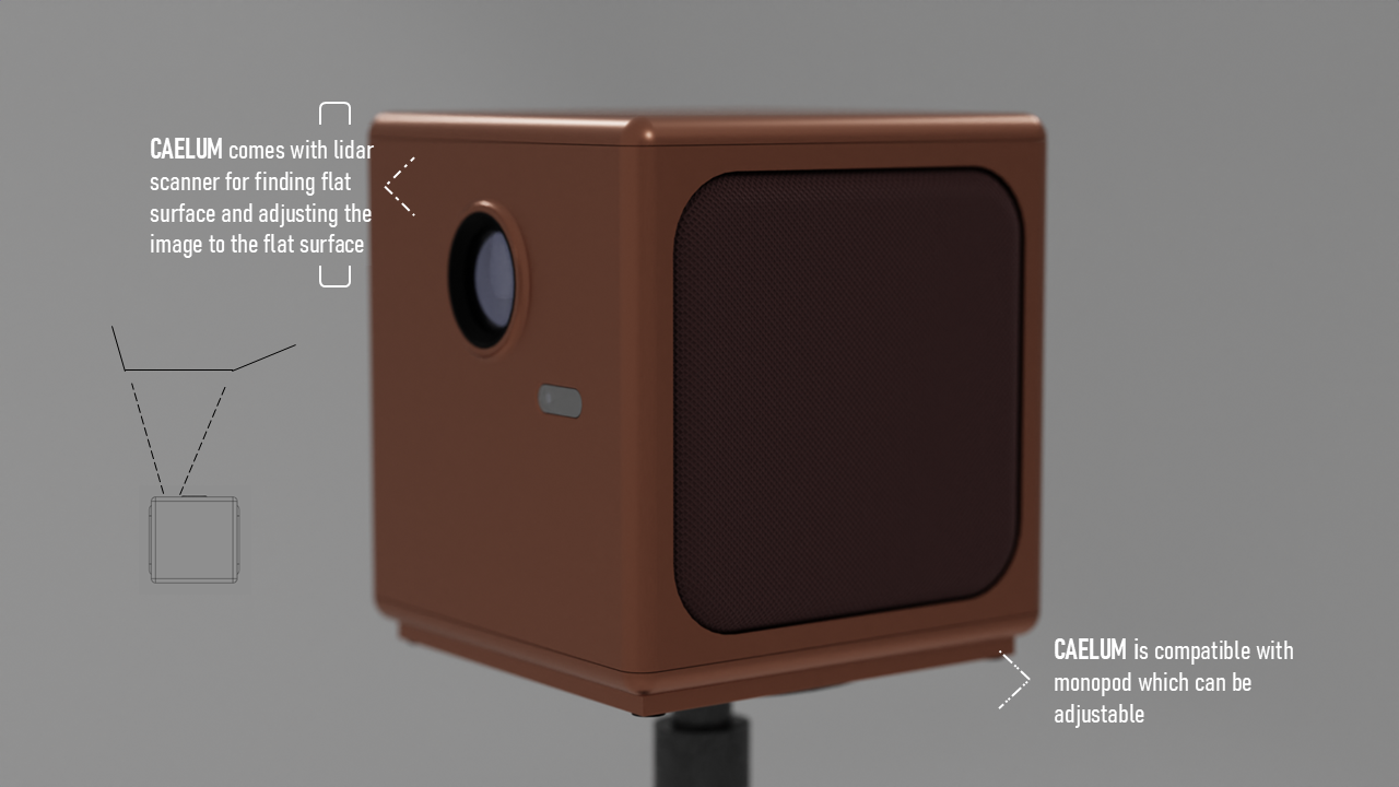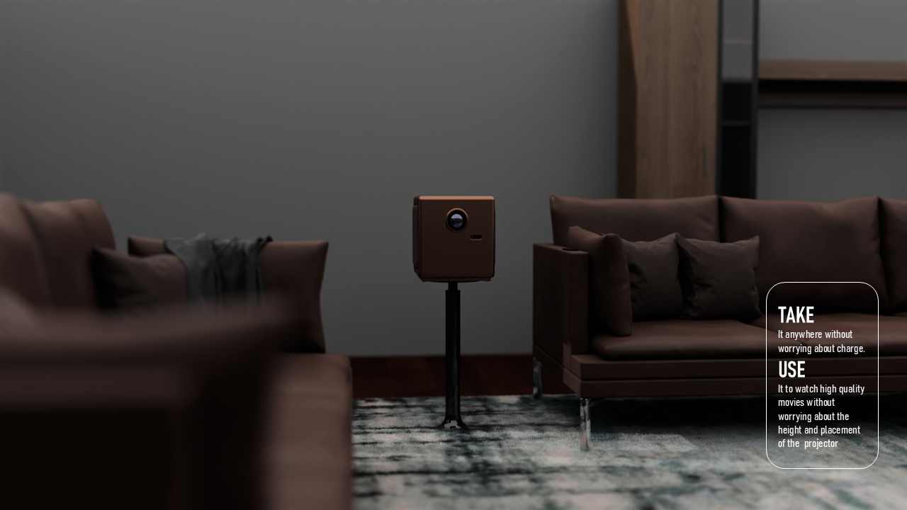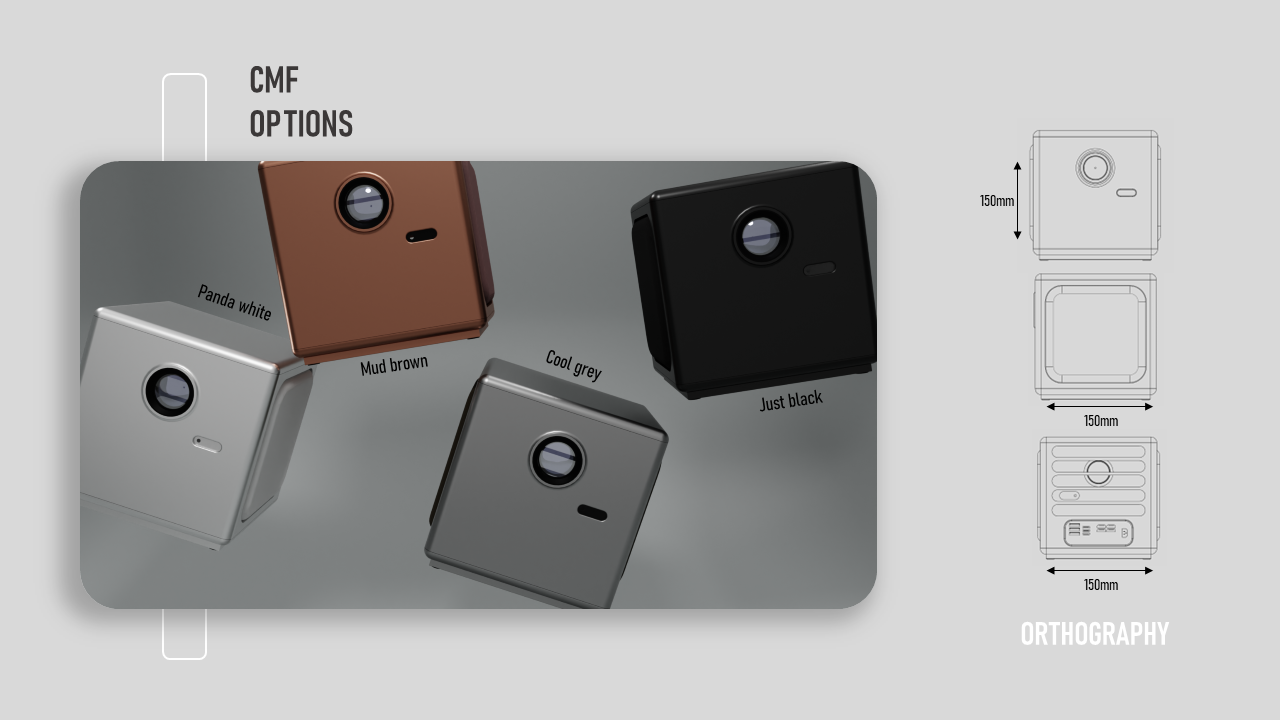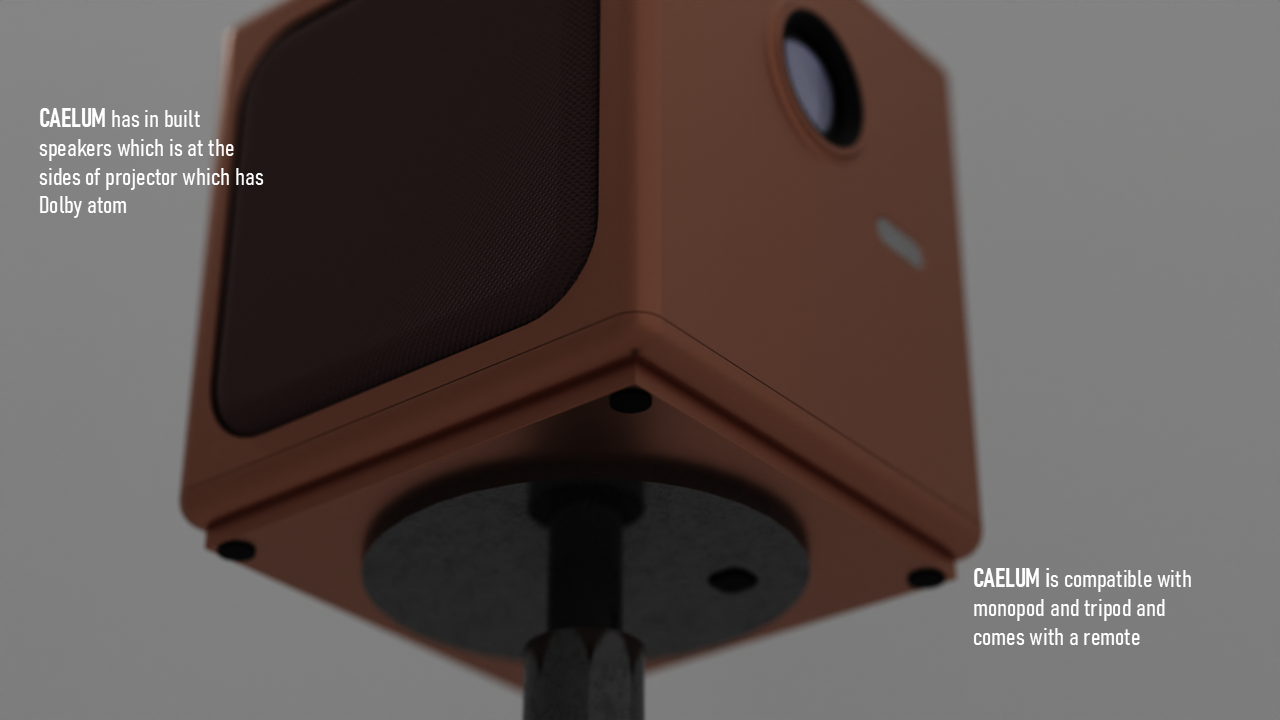 CAELUM is a portable projector concept designed for people who move between rooms and locations and still want an easy, high-quality viewing setup. I studied where projectors are used, what limits portability, and what users actually care about when setting up quickly. I explored multiple form directions, built quick mockups to test proportions, then developed a final design with a clean geometric body, stable mounting support, clear ventilation logic, and a refined CMF range. Deliverables include research framing, concept sketches, CAD form exploration, final renders, CMF options, orthographic views, and packaging.